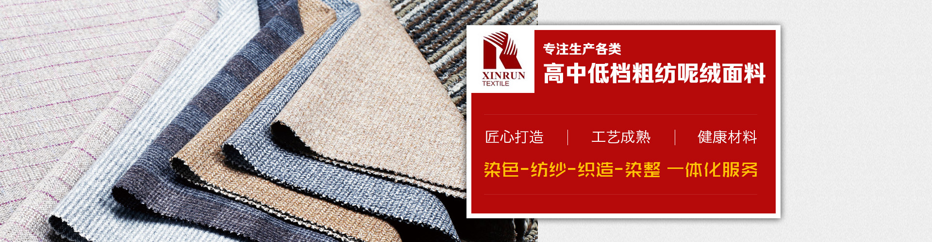主要產(chǎn)品有:法蘭絨、麥爾登,立絨,順毛,兔羊絨,阿爾帕卡,雙面呢,格呢,斜紋呢、圈圈呢、針織毛呢,臺球呢和地毯等幾百個品種以及上千個花色,另外新開發(fā)特種花式紗面料、復(fù)合,印花,扎染,涂層,貼膜,防水,防靜電等各類功能型面料。